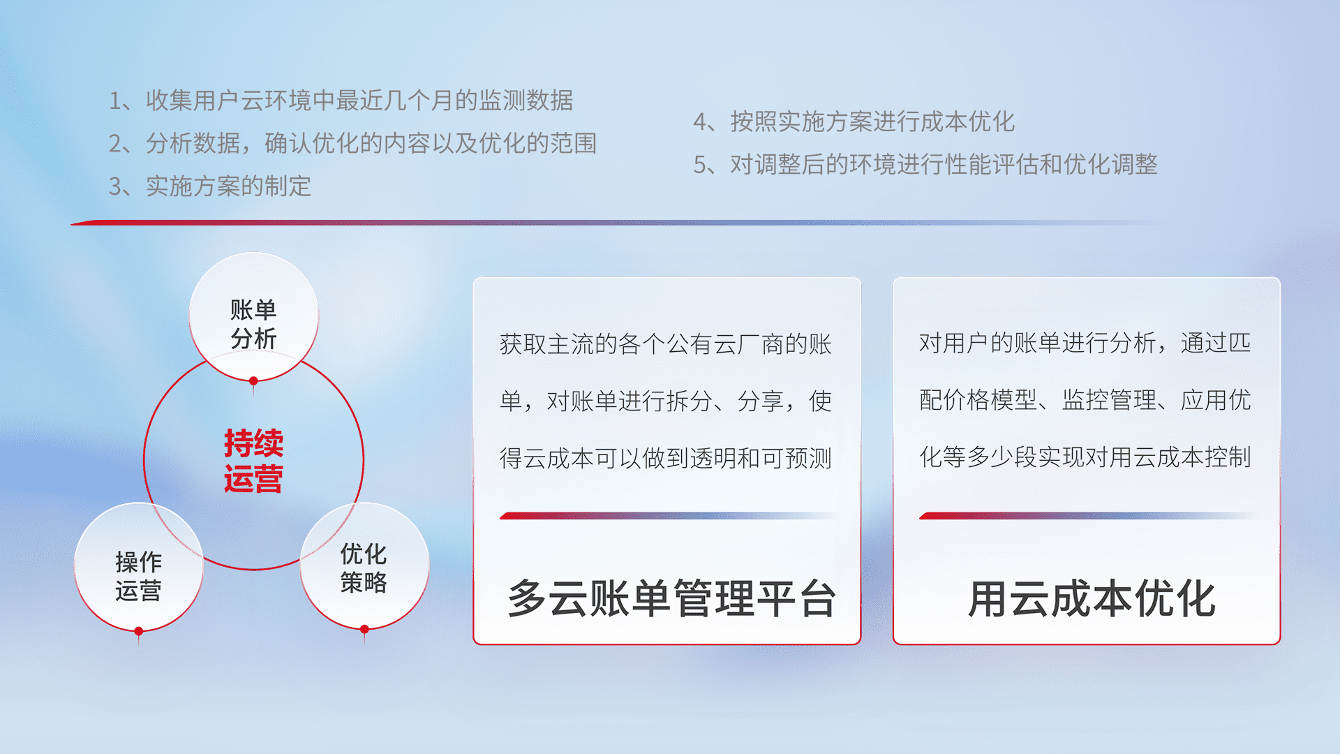 通过多云纳管,,,,以统一的资源数据模型把客户的云资源进行抽象和封装,,进而实现对多云资源的统一操作,,保障云资源管理的可靠性、、、稳定性与可用性。。。。量身定制化运维内容,,,,配置、、、、开发运维、、、、补丁管理、、备份、、、、监控、、认证和访问管理、、、、审计和日常巡检等,,保障在用云过程中的可靠度,,稳定度以及高可用率。。。